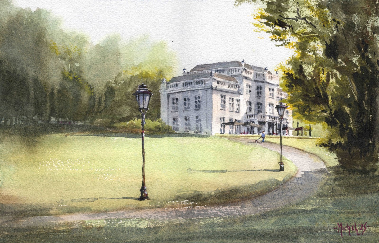 Toen ik hier zat, voelde je dat de zomer op zijn einde liep. Het licht was zachter, warmer, en gleed laag over het gras richting de Stadsvilla. Het frisse groen begon net dat eerste vleugje nazomer te krijgen, waardoor het wit van de villa nog helderder afstak tegen de donkere randen van het park. Ik hield van de rust van dit moment: lange schaduwen, een zacht briesje door de bomen en een paar wandelaars in de verte. In deze compositie wilde ik vooral die overgang vangen, dat stille, gouden licht dat laat in de zomer zo bijzonder is.