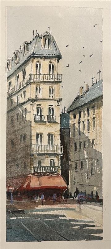 This watercolor beautifully captures a typical Parisian street corner, featuring a monumental corner building that embodies the elegance and charm of Haussmannian architecture. These grand buildings, designed during Baron Haussmann’s 19th-century transformation of Paris, are characterized by uniform facades, wrought-iron balconies, and large windows, creating a timeless and sophisticated streetscape.