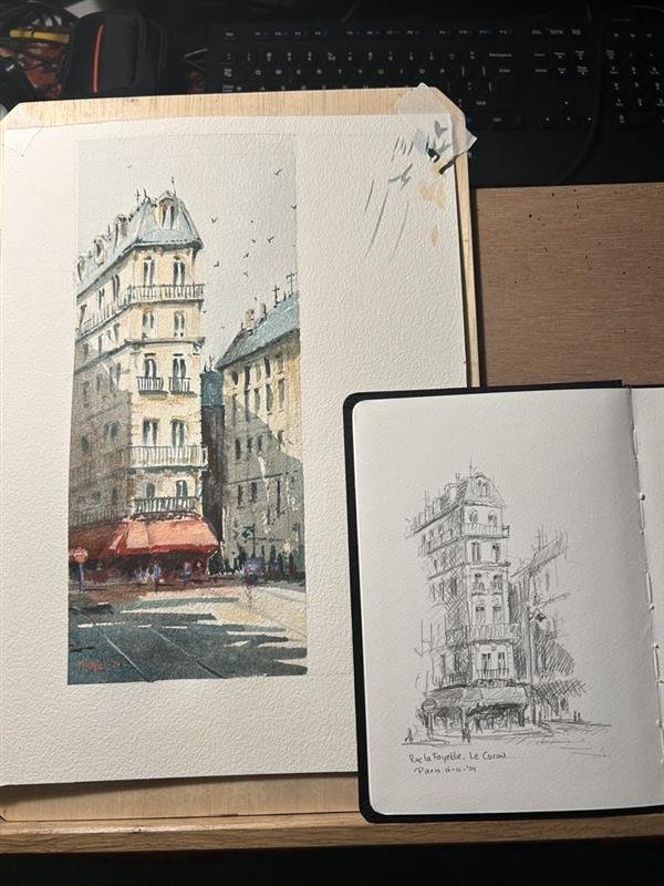 The watercolor’s soft tones and delicate brushstrokes emphasize the play of light and shadow on the building’s facade, evoking the gentle glow of a Parisian morning or the golden hue of sunset. This artwork not only showcases the architectural beauty of a classic Parisian street corner but also captures the atmosphere of daily life, where history, charm, and modernity blend seamlessly in the heart of the City of Light.