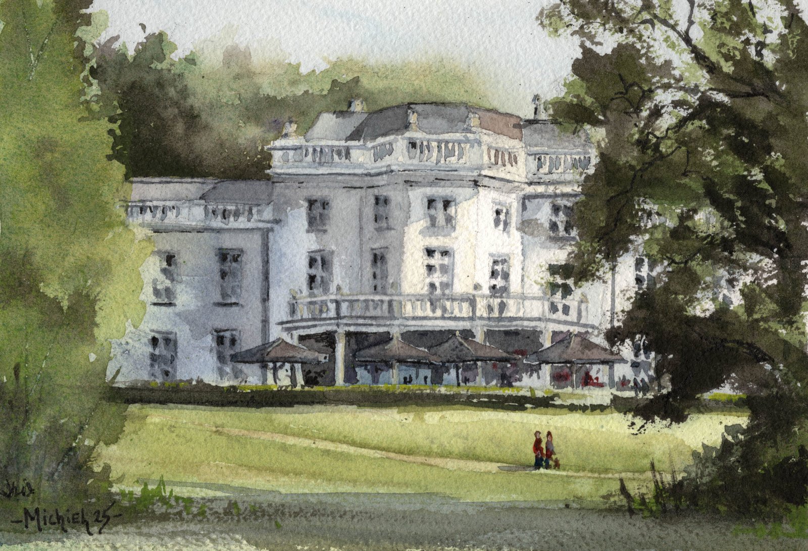 Bij Stadsvilla Sonsbeek word ik altijd getroffen door hoe het licht over het open grasveld strijkt voordat het het witte gebouw raakt. In dit kleine werkje wilde ik dat zachte, warme moment vangen: het spel tussen het koele groen van de bomen en het lichte, bijna glanzende wit van de villa. De twee figuurtjes op het pad geven precies de menselijke schaal die ik zocht. Met een eenvoudige compositie en veel aandacht voor sfeer hoop ik je even mee te nemen naar deze rustige plek in Arnhem.